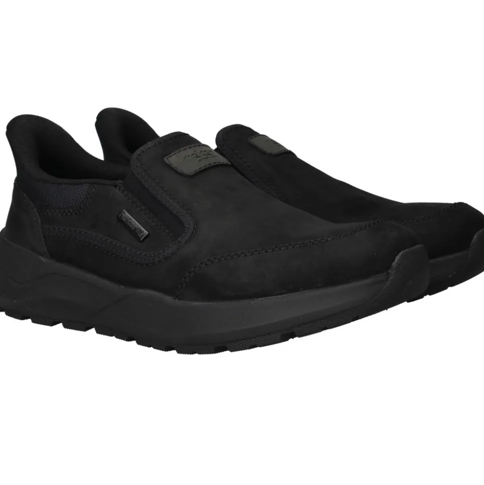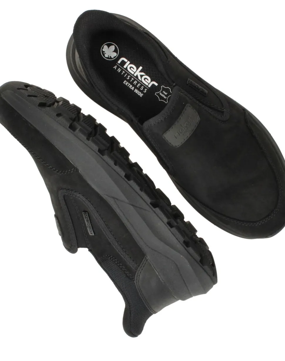 Deze comfortabele van Rieker combineren een sportieve look met optimaal draagcomfort. De zwarte instapper is gemaakt van nubuck en kunstleer, heeft voetwijdte H en is dankzij RiekerTex waterafstotend.