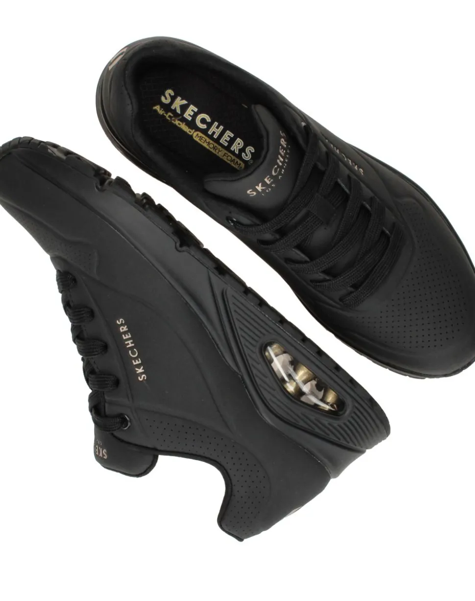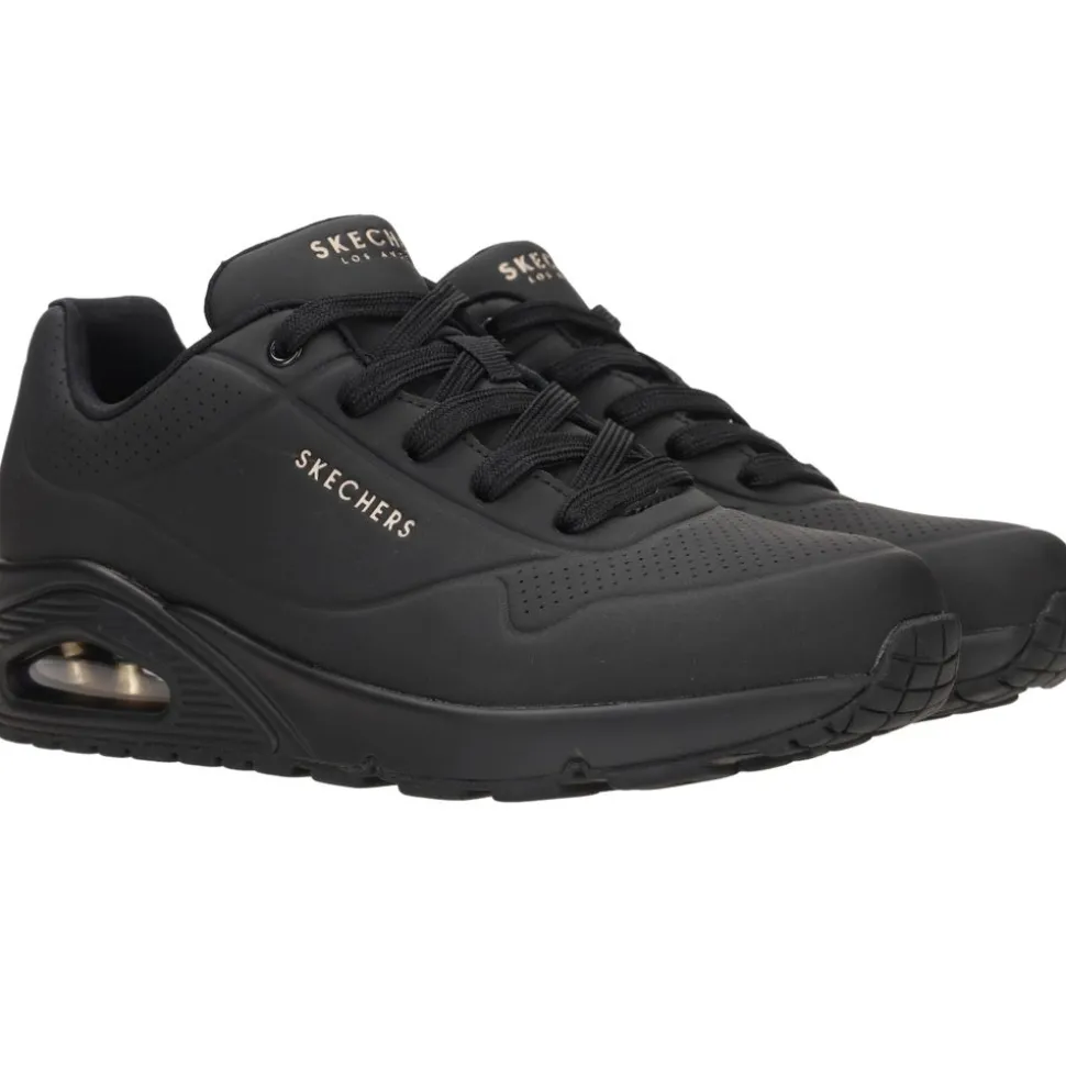 De van bieden een perfecte balans tussen stijl en comfort. Deze zwarte Skechers Uno Stand on Air is gemaakt van duurzaam kunstleer met een zachte textielvoering, speciaal ontworpen voor dames die graag de hele dag actief zijn. De luchtkussenzool zorgt voor extra demping en een licht gevoel bij elke stap.