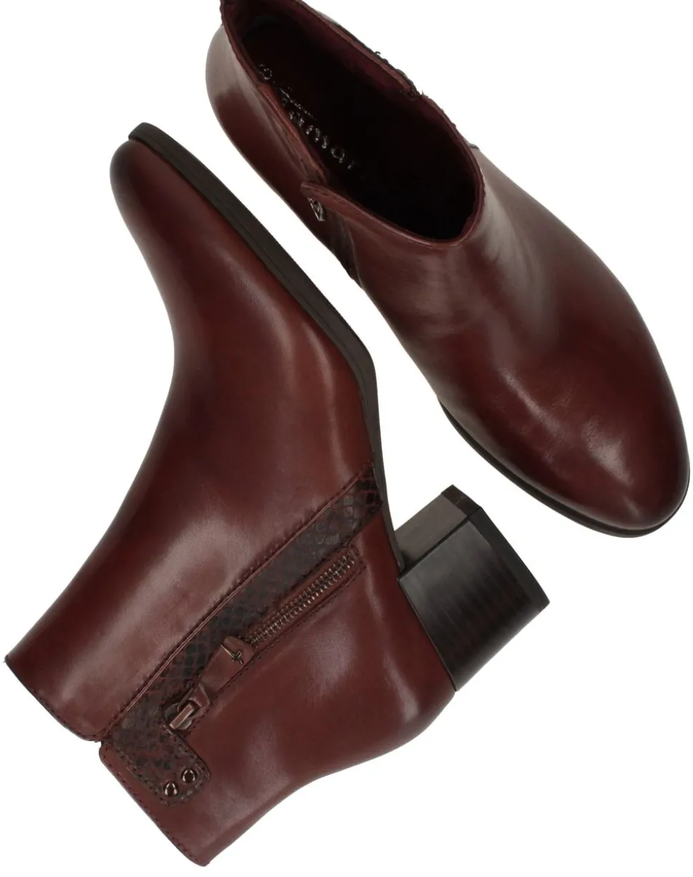 De enkellaarsjes zijn een stijlvolle en comfortabele keuze voor dames die houden van elegantie met een vleugje luxe. Deze cognackleurige zijn uitgevoerd in hoogwaardig leer en hebben een subtiel reliëfdetail langs de rits dat zorgt voor een chique uitstraling. Dankzij de stabiele blokhak zijn ze ideaal voor dagelijks gebruik en geven ze je outfit een modieuze boost.