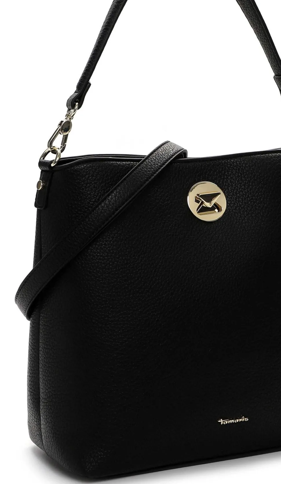 De Tamaris Gladis handtas in zwart is een stijlvolle blikvanger met een moderne en vrouwelijke uitstraling. Deze tas is gemaakt van hoogwaardig kunstleer en voorzien van elegante gouden details die de luxe look versterken. Dankzij het praktische ontwerp met zowel een hand- als schouderhengsel kun je de tas op verschillende manieren dragen. Het ruime hoofdvak met ritssluiting biedt voldoende ruimte voor al je dagelijkse essentials.