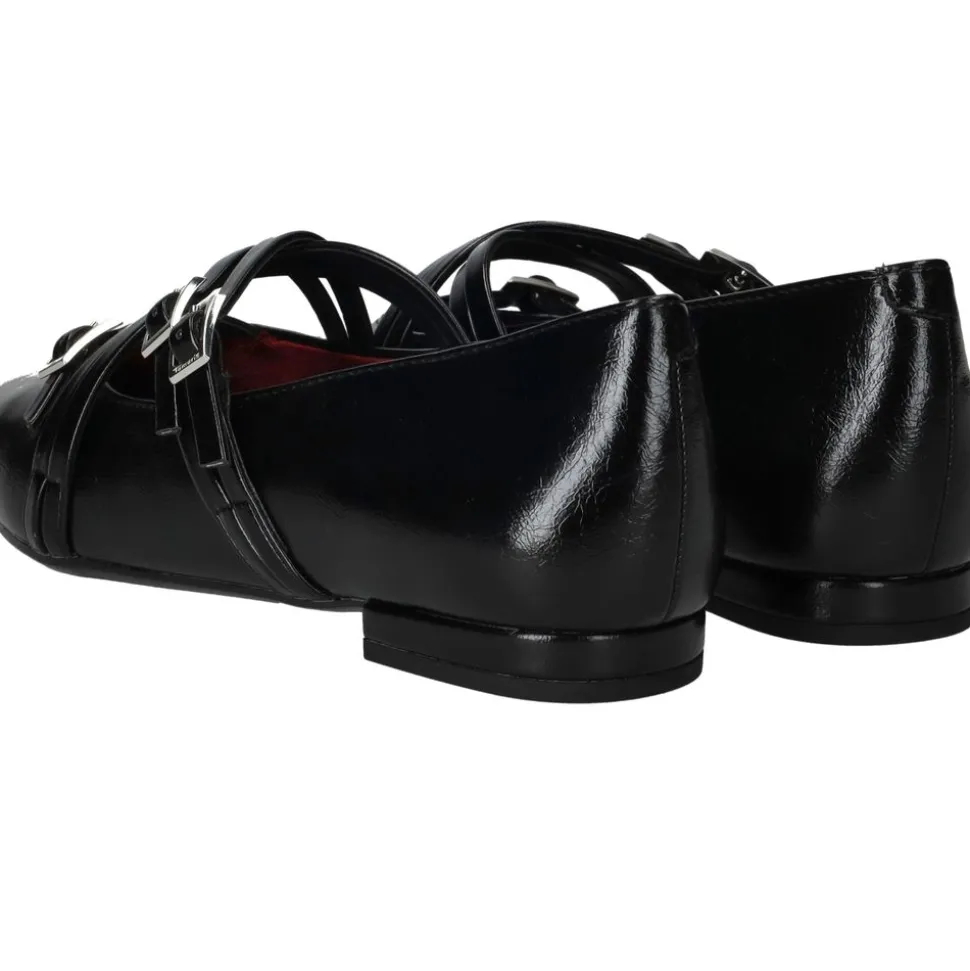 Deze zwarte combineren een verfijnde uitstraling met een moderne twist. Het kunstleer heeft een subtiele glans en de puntige neus zorgt voor een elegante look. De gekruiste bandjes met gespsluiting geven de schoen extra karakter én zorgen ervoor dat hij stevig aan de voet blijft zitten. Met een zachte synthetische voering en voetbreedte G zijn ze ideaal voor stijl én comfort.