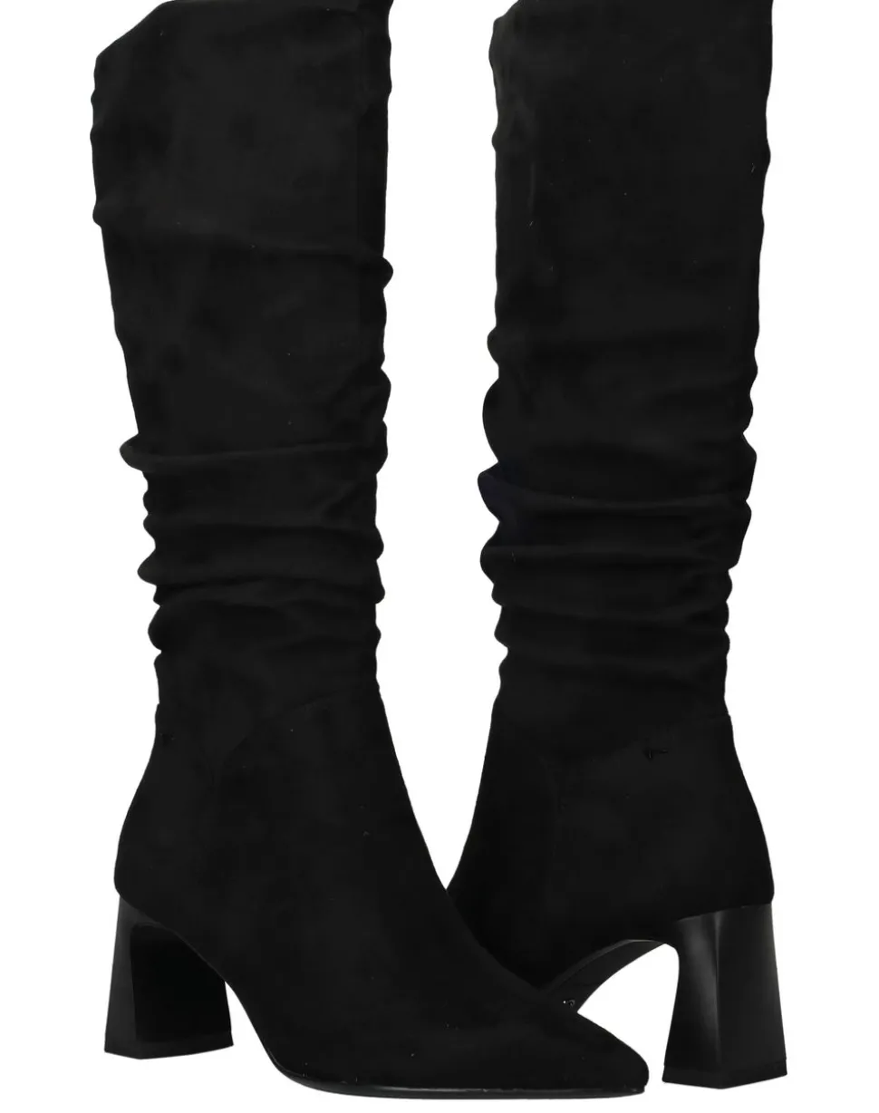 Deze voor in klassiek is een perfecte mix van elegantie en comfort. De buitenkant is uitgevoerd in zacht textiel met een suède-achtige uitstraling, wat de laars een luxe en moderne look geeft. De geplooide schacht en slanke hak creëren een vrouwelijk silhouet dat moeiteloos past bij zowel casual als chique outfits. De textielen voering zorgt voor ademend draagcomfort, zodat je deze laars de hele dag met plezier draagt.