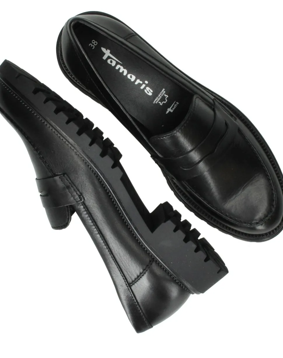 Deze zwarte loafers zijn een elegante én comfortabele keuze voor dames die op zoek zijn naar een klassieke schoen met een moderne twist. Het gladde leer geeft een luxe uitstraling, terwijl de stevige zool zorgt voor een stoere touch. De combinatie van kunstleer en textiel aan de binnenkant maakt ze fijn om langdurig te dragen. Dankzij voetbreedte G zitten ze mooi aangesloten zonder te knellen.