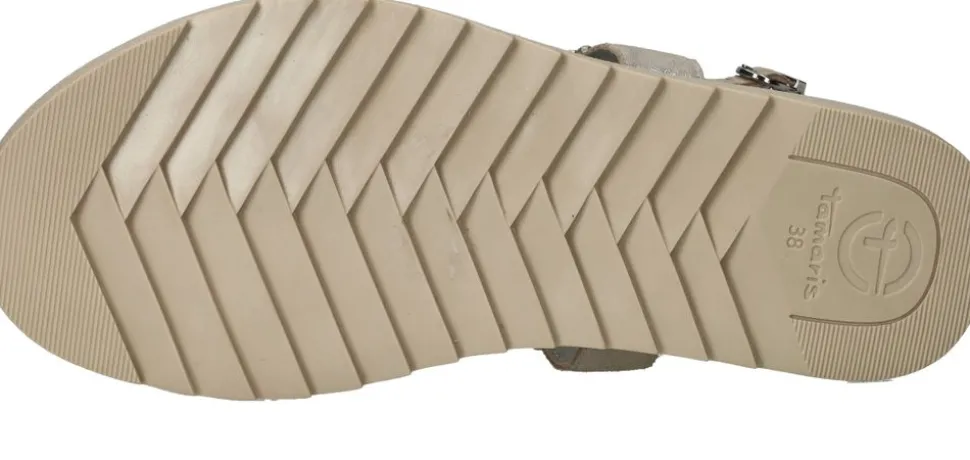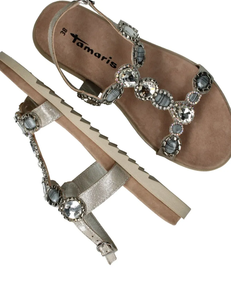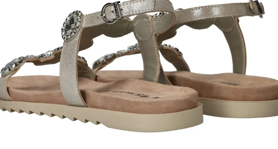 - Deze sandaal heeft een voorgevormd voetbed gemaakt van leer.