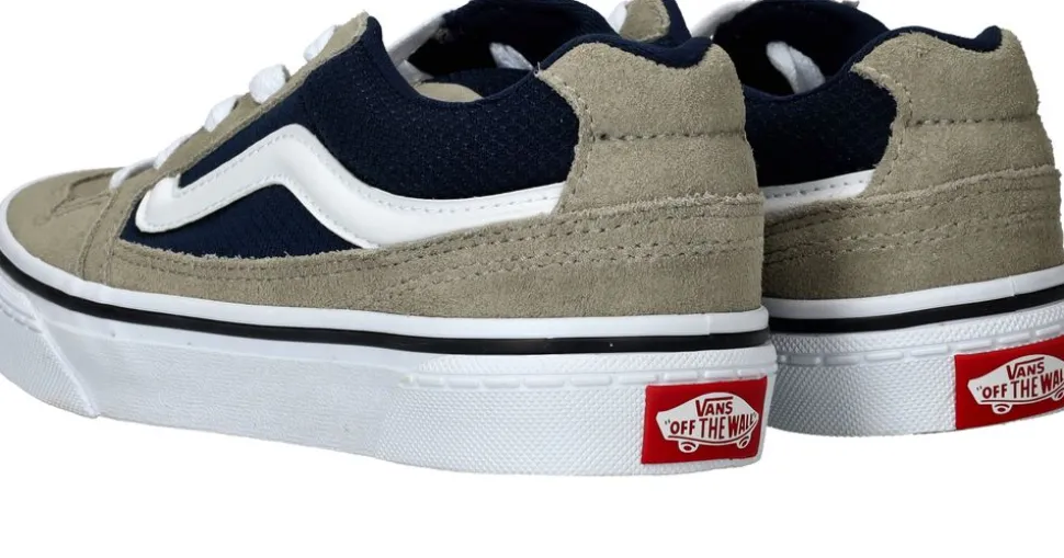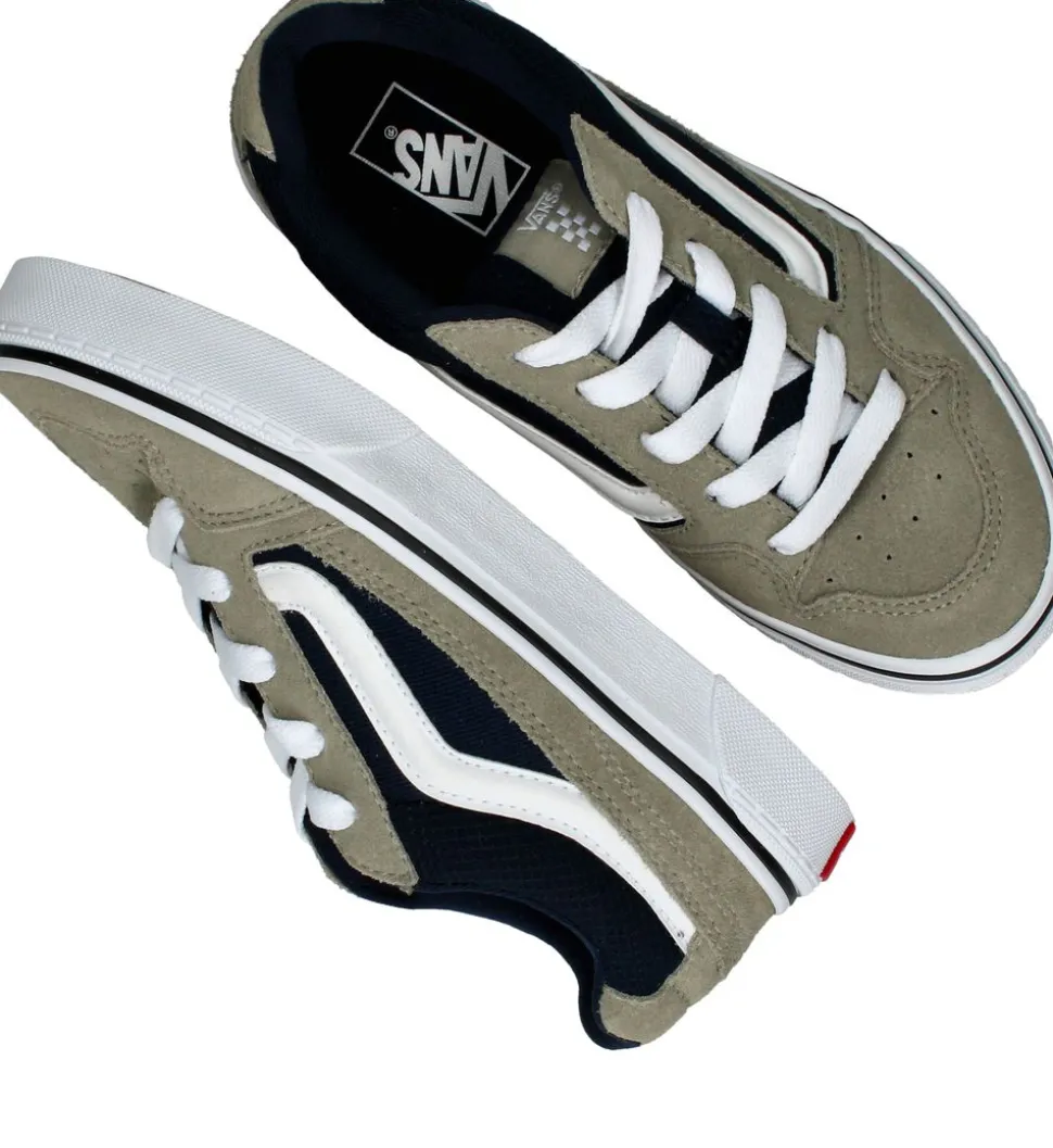 - Deze grijs, blauwe sneaker is gemaakt van leer en textiel.
