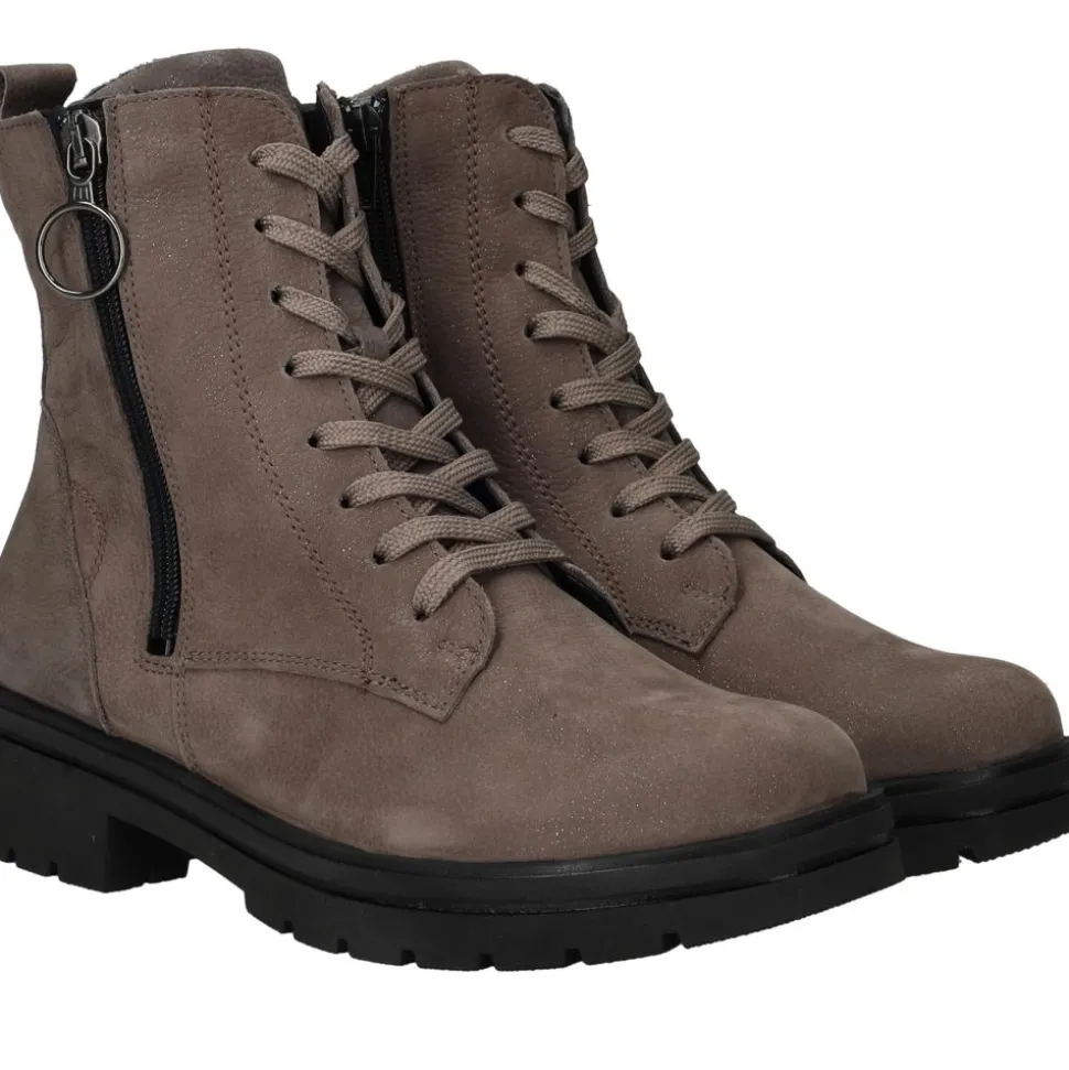 Deze stijlvolle is uitgevoerd in een elegante taupe kleur met subtiele glitterdetails. De schoen is gemaakt van hoogwaardig nubuck en heeft een comfortabele K-wijdte, waardoor hij ook geschikt is voor bredere voeten. Dankzij de combinatie van vetersluiting en ritssluiting trek je deze boots eenvoudig aan en uit, terwijl de stevige zool zorgt voor een stabiele loopervaring.