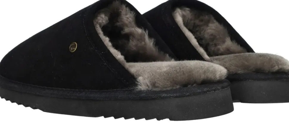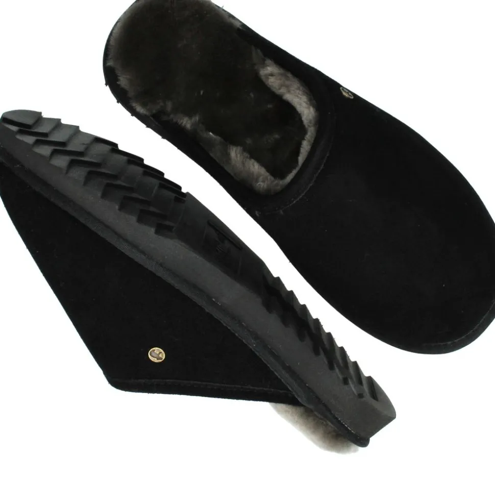 - De zwarte pantoffel heeft een bovenwerk van suède.