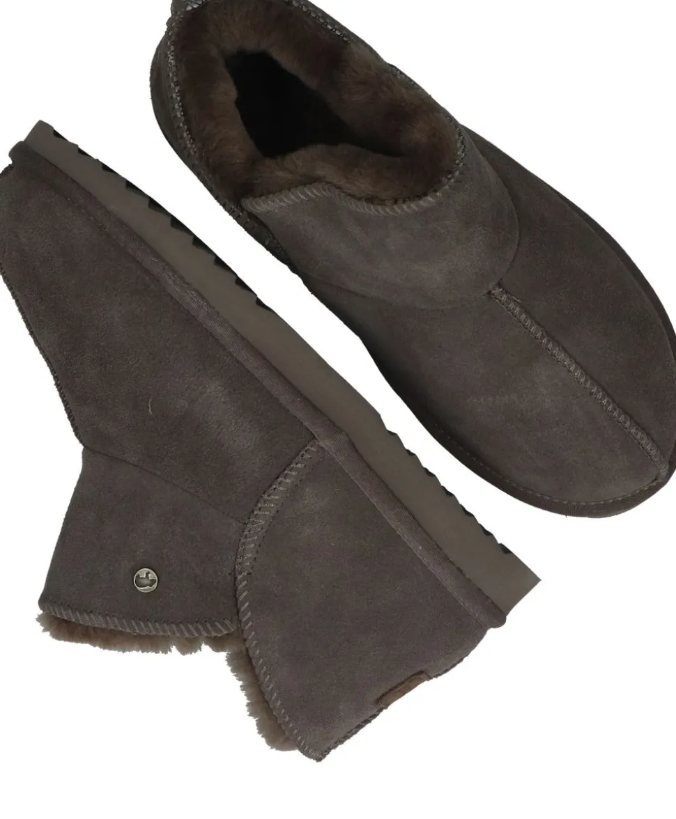 - De zwarte pantoffel heeft een bovenwerk van suède en is gevoerd met merinowol.