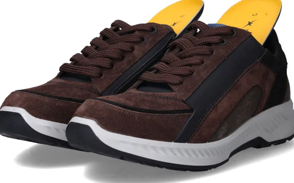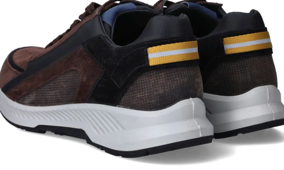 De Xsensible Yukon sneaker combineert een stoere uitstraling met ongeëvenaard comfort. Deze sportieve herenschoen is uitgevoerd in bruin textiel en leer, afgewerkt met zwarte details en een subtiel kleuraccent op de hiel. Perfect voor zowel casual outfits als een actieve levensstijl.